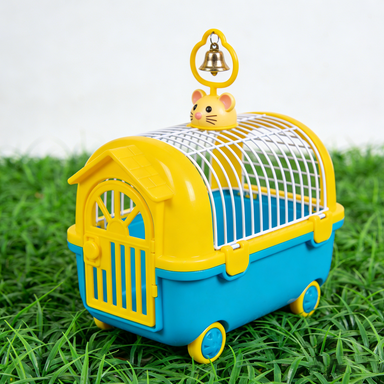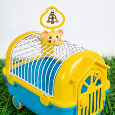 Jak pokazano na niebiesko-żółtym obrazku klatka dla zwierząt, zaprojektowana specjalnie dla małych zwierząt, z uroczą dekoracją w kształcie głowy myszy i złotym dzwonkiem. Cena hurtowa 12-15 USD/szt. (w oparciu o MOQ), minimalne zamówienie 100 sztuk, możliwość dostosowywania funkcji i etykietowania prywatnego.